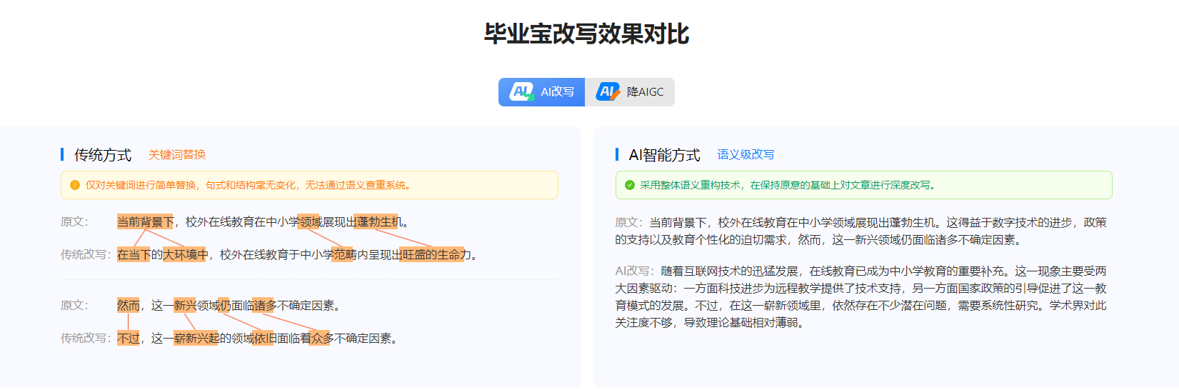 產品定位:畢業寶?AI?改寫工具是專為高校學生打造的AI智能工具,基于自研垂直大模型打造學術寫作智能解決方案,提供精準降重+AIGC風險防控雙重保障,助力學生高效通過論文審核。采用最新強化學習技術訓練的大語言降重模型,在忠于原文的前提下,實現重復率低于5%的“語義級”智能改寫。畢業寶聚焦論文查重率優化與AI生成內容(AIGC)風險防控兩大場景,幫助學術基礎薄弱的學生實現“無痛降重、合規畢業”。